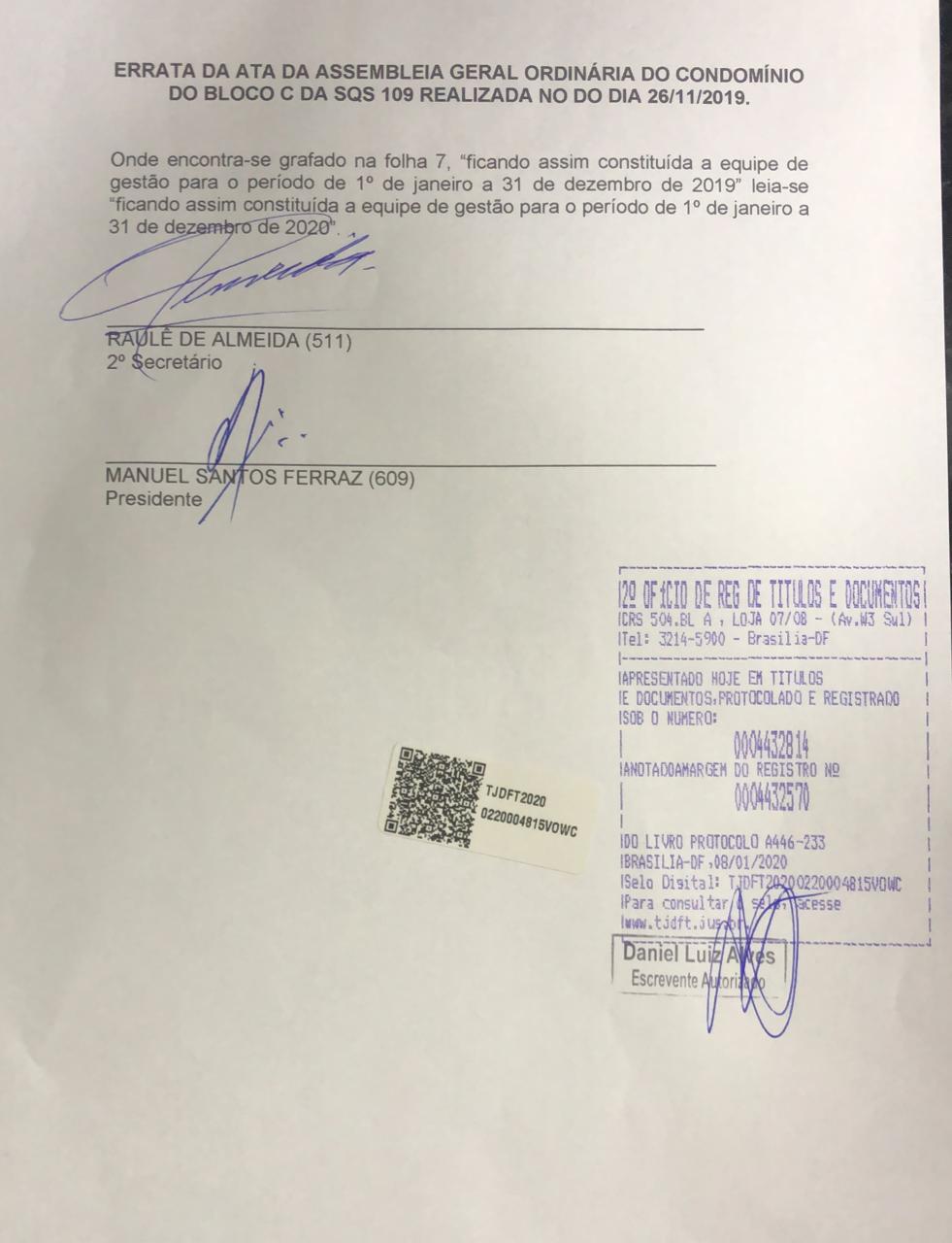 Errata da Ata da AGO realizada no dia 26/11/19